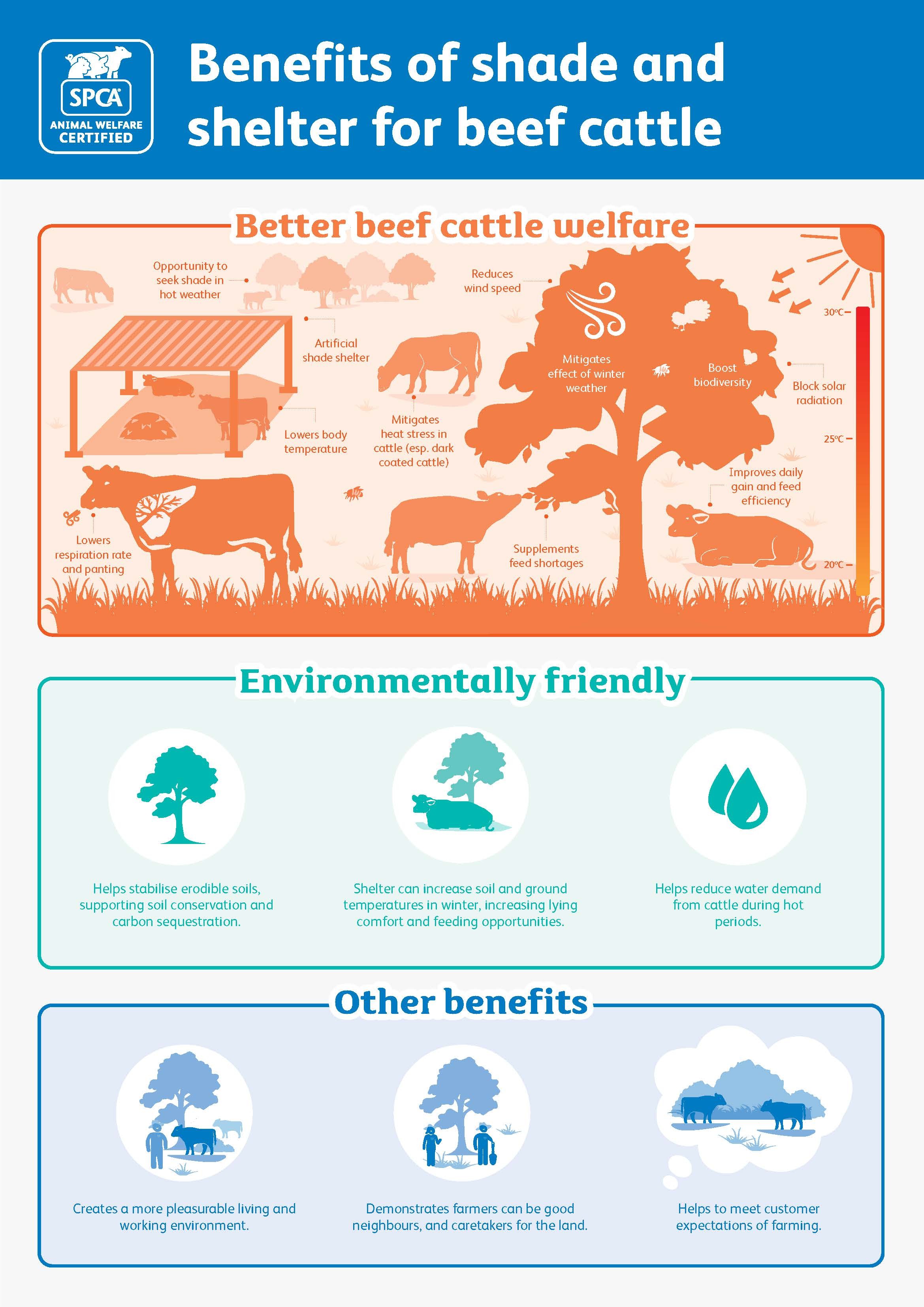 SPCA Certified standards for beef and dairy cattle explicitly require access to shade and shelter for cattle at all times so the animals can manage their own temperature requirements to avoid discomfort and heat and cold stress. This goes further than the legal minimum standards.