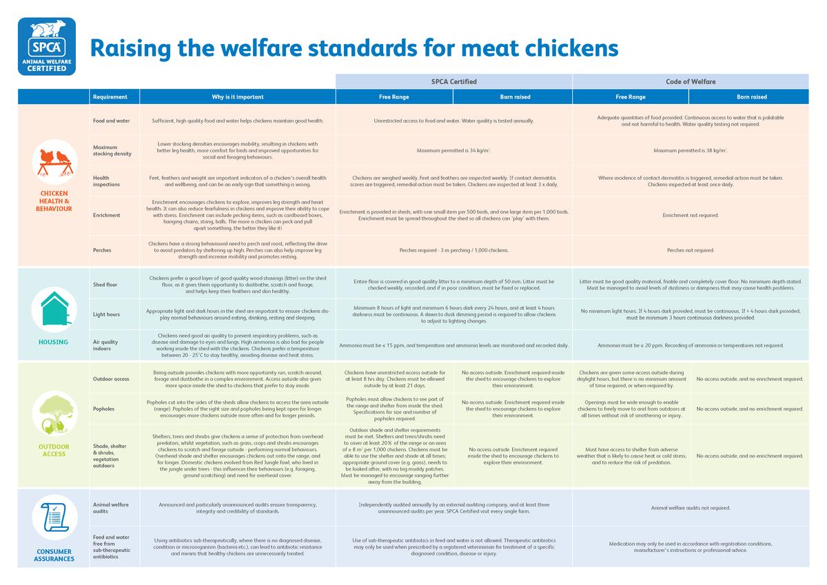 SPCA Certified has animal welfare standards for both free range and barn raised meat chickens that ensure animal welfare is improved by exceeding the minimum legal requirements laid out in the Code of Welfare.