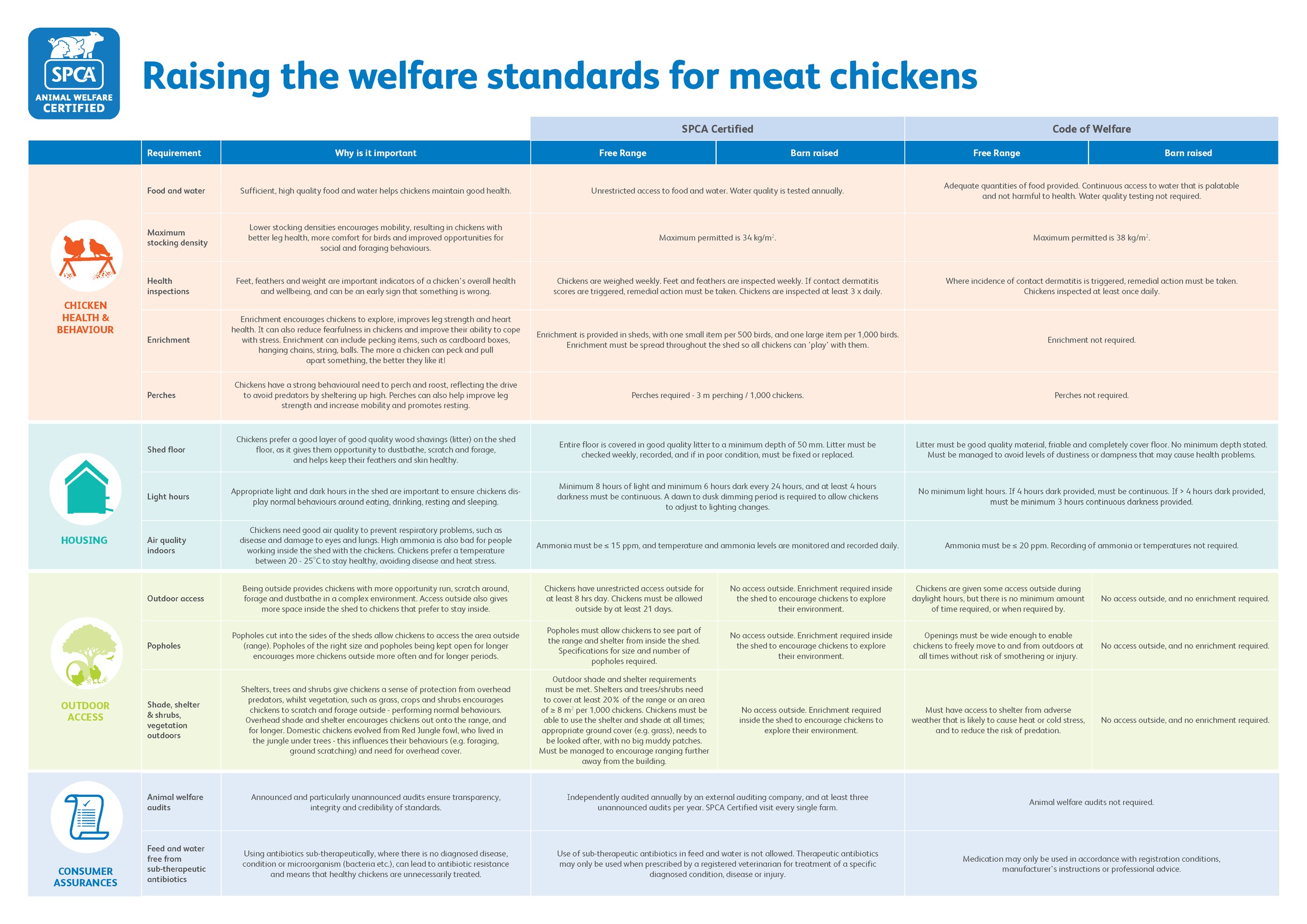 At SPCA Certified we believe in making it easier for consumers to know what they are buying and how to support better welfare. The infographic below compares welfare requirements for meat chickens under the Code of Welfare and SPCA Certified standards. See how the different standards compare in terms of meat chicken health and behaviour, housing, outdoor access, and consumer assurances for free range and barn raised meat chickens.
